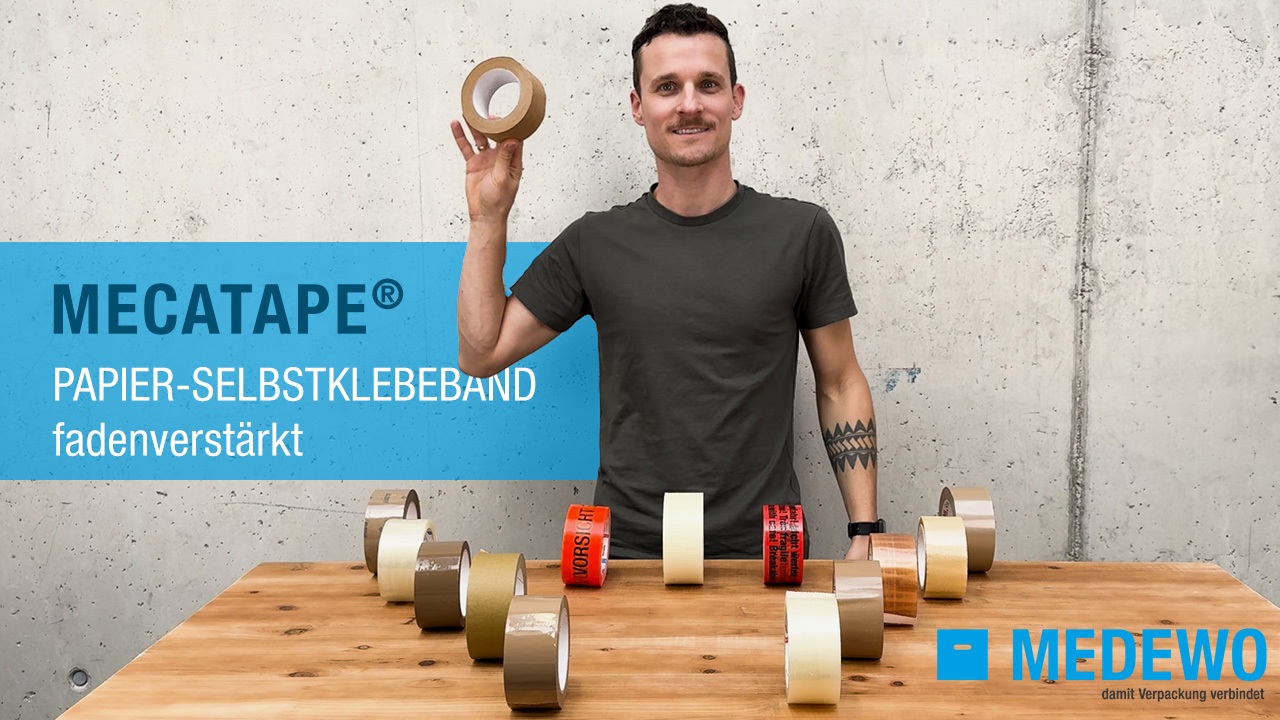 Das MECATAPE® Papier-Selbstklebeband fadenverstärkt bietet eine umweltfreundliche Alternative zu herkömmlichen Kunststoffklebebändern. Durch die Verstärkung mit Polyesterfäden besitzt es eine aussergewöhnlich hohe Reissfestigkeit und eignet sich somit ideal zum sicheren Verschliessen von mittelschweren bis schweren Kartonagen.