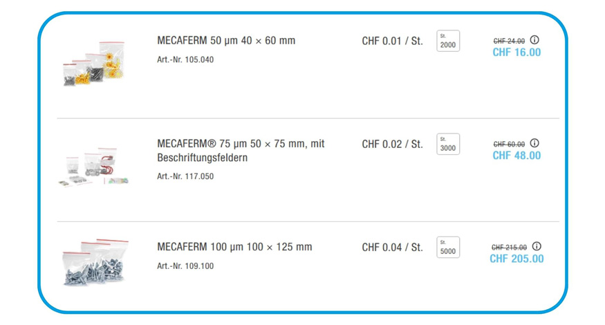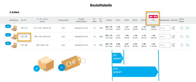 Im Web-Shop können Sie über den grauen Button «Grossmengen anfragen» unter der Preistabelle, direkt Kontakt mit unseren Verpackungsexperten aufnehmen und Ihren Grossmengen-Wunsch angeben.