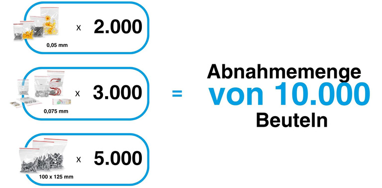 Sie legen 2.000 Beutel mit 0,05 mm Folienstärke in den Warenkorb. Zusätzlich wählen Sie 3.000 Beutel mit einer anderen Folienstärke. Anstatt der Einzelstückpreise für die jeweiligen Beutelmenge erhalten Sie automatisch – für beide Artikel – den Preis für eine Menge von 5.000 Stück. Das ist laut Preistabelle die nächstmögliche Preisstaffel. Legen Sie nun nochmals 5.000 Beutel mit einem andern Nutzmass in den Warenkorb, erhalten Sie für alle drei Artikel einen noch höheren Rabatt. Für alle drei Artikel gilt nun der Stückpreis für eine Abnahmemenge von 10.000 Stück.