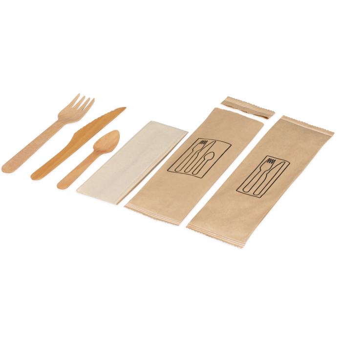 Hygienisch in Papierhüllen verpacktes Holzbesteck mit angenehm weicher Beschichtung aus Naturwachs. Die zeitsparend vorbefüllten Sets (unterschiedliche Besteckteile plus Serviette) eignen sich ideal als nachhaltiges Einweg-Besteck für Take-away & Co., wenn Sie Ihren Kunden Gabel, Messer oder (Kaffee-)Löffel mitgeben möchten.