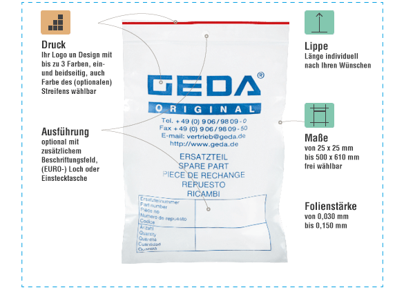 Gestalten Sie diese ganz nach Ihren Wünschen, denn individuell bedruckt wird aus der Verpackung ein idealer Werbeträger. Auch innerbetrieblich profitieren Sie von den individualisierten Beuteln: Für unterschiedliche Inhalte oder Einsatzzwecke können Sie diese z. B. verschiedenfarbig gestalten oder mit Beschriftungsfeldern versehen.