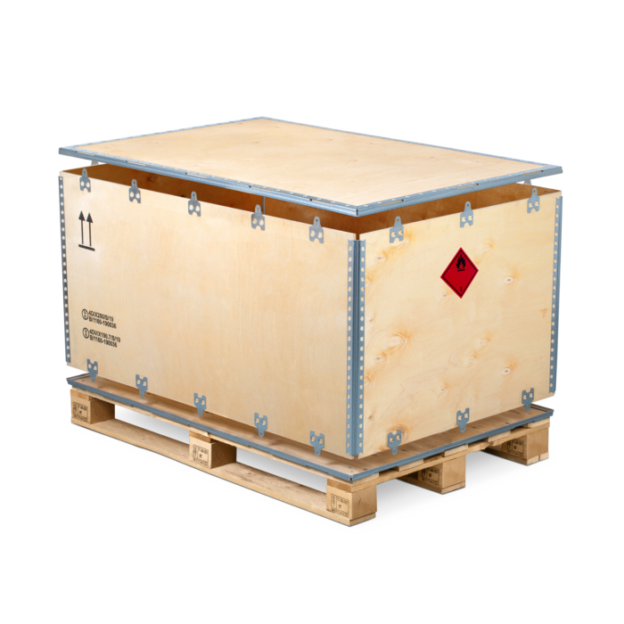 Gefahrgut sicher, schnell und nachhaltig verpacken. Mit den transportbereiten und sehr stabilen Holzkisten, die bereits mit Kufen bzw. Palette versehen sind, sind selbst mittelschwere bis schwere Gefahrgüter im Handumdrehen verpackt. Auch für den Export und Überseetransport geeignet.