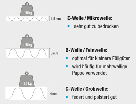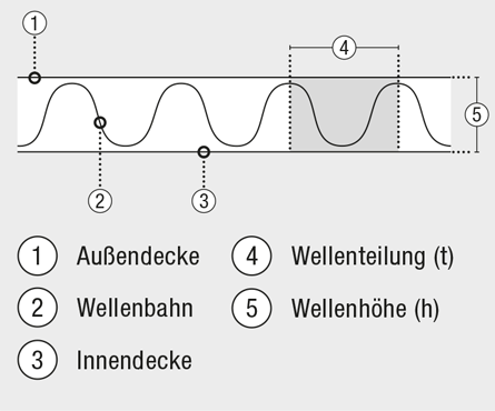 Zur Definition von Wellpappe-Arten ist die Wellenhöhe und die Wellenteilung maßgebend. Diese Werte legen fest, um welchen Wellentyp es sich handelt und welche Eigenschaften er bietet.