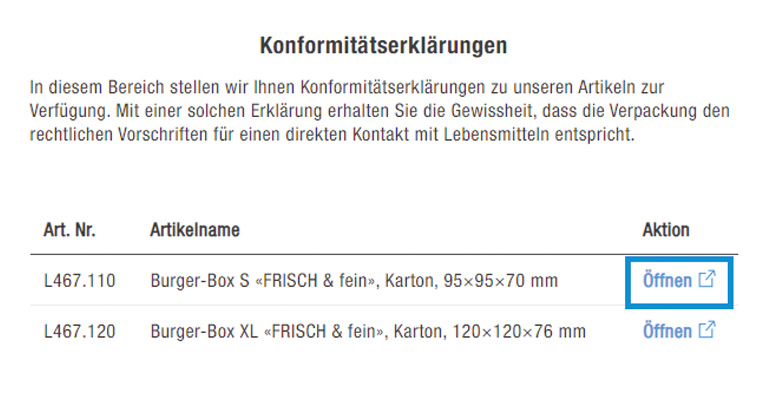 Auf den Button «Downloads» klicken. Unter den «Produktdatenblättern» liegen die gewünschten Konformitätserklärungen Ihrer gewählten Lebensmittelverpackung.