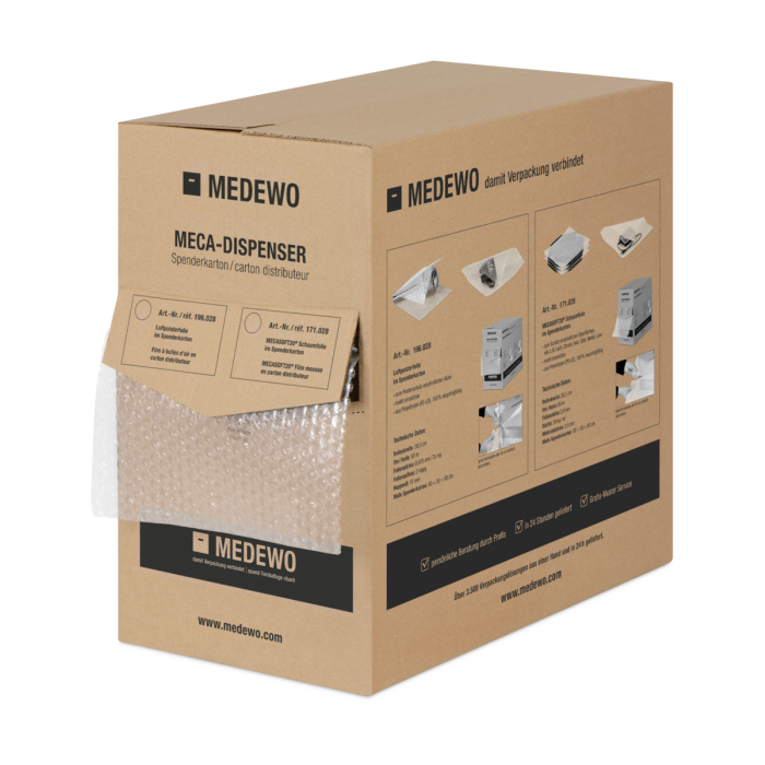 Die perforierte Recycling-Noppenfolie schützt empfindliche Waren wie Glas, Porzellan oder Geschirr zuverlässig vor Stößen und Feuchtigkeit. In der kompakten Spenderbox bleibt die Folie sauber und vor Verschmutzung geschützt, zudem ermöglicht sie einen flexiblen Transport zwischen Arbeitsplätzen oder unterwegs.