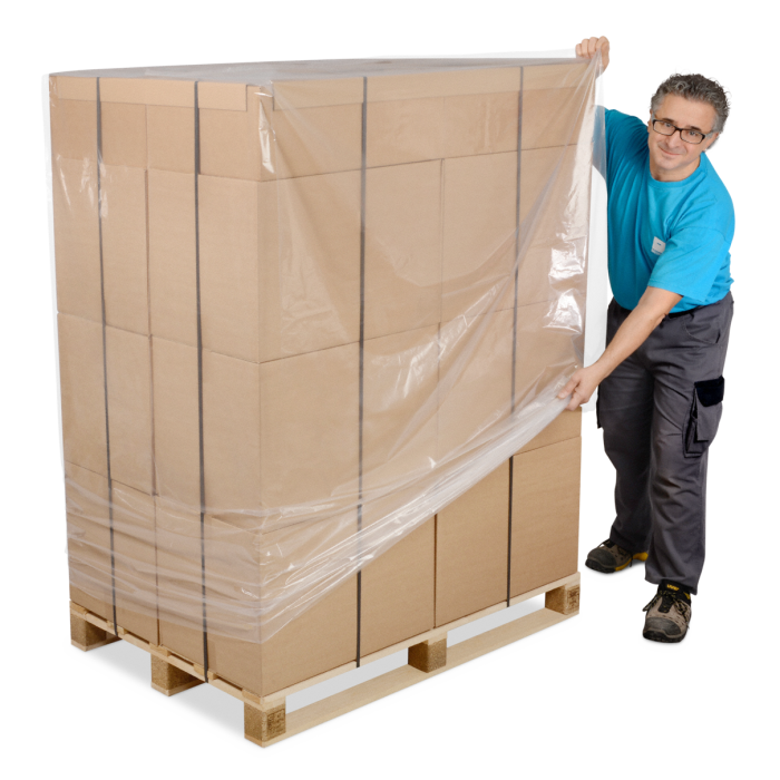 Robuste Palettenhaube schützt Ihre Waren gegen Staub, Schmutz und Nässe oder umhüllt sperrige Güter.