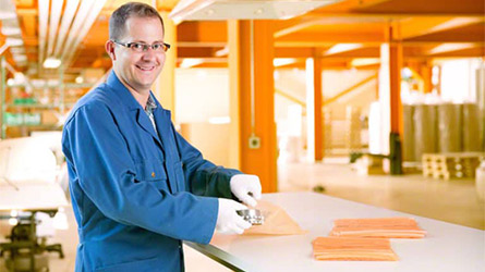 Person gibt Metallteil in VCI-Verpackung Person gibt Metallteil in VCI-Verpackung